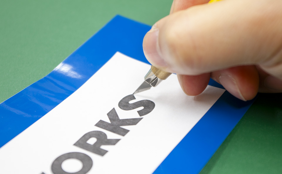 図4-1: 台紙にデザインナイフの痕が薄っすらと入るくらいが丁度良い力加減です。カッティングシート部分のみを切ろうとすると、剥がす際に意外と切れ残りが生じやすく、逆に力を入れすぎてしまうと、台紙まで切り抜いてしまいますので注意してください。いらない端材や端っこの方で練習してみましょう。