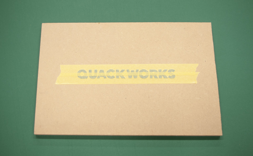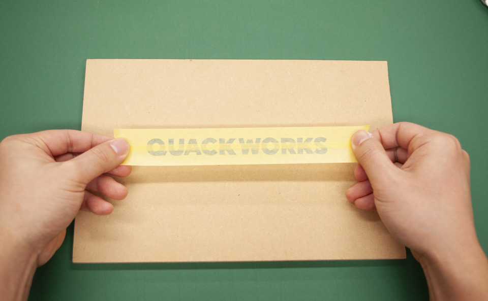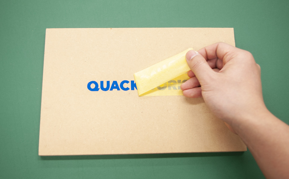 図8-2: 今回はMDF(中密度繊維板)に貼り付けます。比較的小さいものなので、目視で位置合わせをしました。貼り方はデザインの形によって変えるべきですので、貼り方のページも合わせてご覧いただけますと、より理解しやすいかと思います。